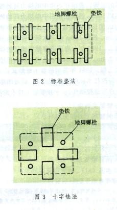 墊鐵一般應在靠近地腳螺栓的兩側(cè)安放,稱標準墊法(圖2)。根據(jù)設(shè)備底座的大小、構(gòu)造型式和地腳螺栓間距的不同,還有不同的墊法。例如:當設(shè)備底座小i地腳螺栓間距較近時,可采用在兩根地腳螺栓之間只安放一組墊鐵的十字墊法(圖3);當?shù)啬_螺栓間距較遠時,除采用標準墊法外,還需采用在中間增加一組墊鐵的輔助墊法;對大型設(shè)備可根據(jù)底座形狀和地腳螺栓間距的大小,采用包括標準墊法、十字墊法和輔助墊法的混合墊法。